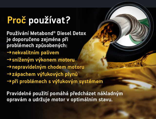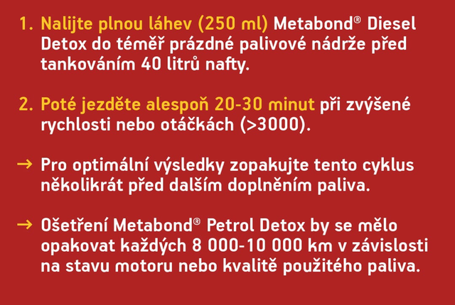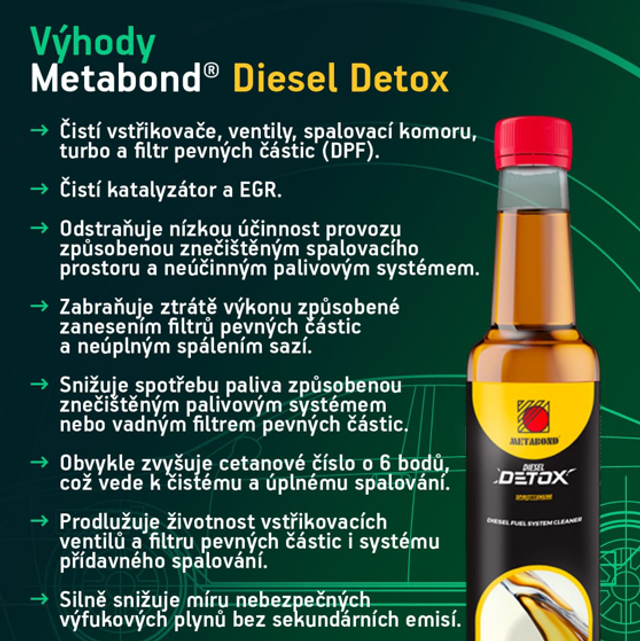 Metabond Diesel Detox je komplexní čistič a regenerační prostředek pro vznětové motory, který účinně odstraňuje usazeniny z vstřikovačů, ventilů, EGR, DPF/FAP, katalyzátoru, turba i celého palivového systému. Zlepšuje spalování, snižuje emise, spotřebu paliva a obnovuje výkon motoru. Obsahuje organokovové přísady, které snižují teplotu vznícení sazí a podporují regeneraci DPF, čímž prodlužují životnost filtrů i vstřikovačů. Obvykle zvyšuje cetanové číslo o 6 bodů a zajišťuje správné mazání čerpadla. Eliminuje hrubý volnoběh, váhání motoru, špatnou reakci na plyn i zápach síry. Vhodný pro všechny dieselové motory s DPF, SCR, AdBlue i bez nich. Nepoužívat u paliva s více než 30 % bionafty. Aplikace: 250 ml do téměř prázdné nádrže před tankováním 40 l nafty, poté 20–30 min jízdy ve vyšších otáčkách. Opakovat každých 8–10 tis. km. Vyrobeno v EU, balení 250 ml.