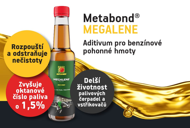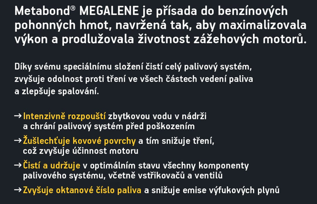 Metabond Megalene Plus je špičková přísada do benzínu pro zážehové motory, která chrání palivovou soustavu, zvyšuje výkon a prodlužuje životnost motoru. Čistí vstřikování, karburátor, ventily i spalovací prostor, rozpouští vodu v nádrži a zabraňuje korozi. Zlepšuje proces hoření, zvyšuje oktanové číslo paliva o 1,5 %, snižuje spotřebu a emise, brání usazování uhlíku i oxidaci paliva a stabilizuje jeho kvalitu při dlouhodobém skladování. Díky zušlechtění kovových povrchů a mazání vstřikovacího systému výrazně snižuje tření i opotřebení při studených startech. Vhodný pro všechny typy zážehových motorů (atmosférické, přeplňované, dvoutaktní, čtyřtaktní, s katalyzátorem i bez). Použití: 5 ml aditiva na 10 l paliva, u dvoutaktních motorů přidejte přímo k benzínu nebo směsi benzínu s olejem. Čisticí účinek se projeví po spálení cca 500 l ošetřeného paliva. Určeno i do benzínu E10, nepoužívat v čistém bioetanolu.