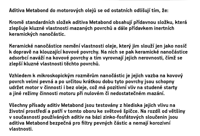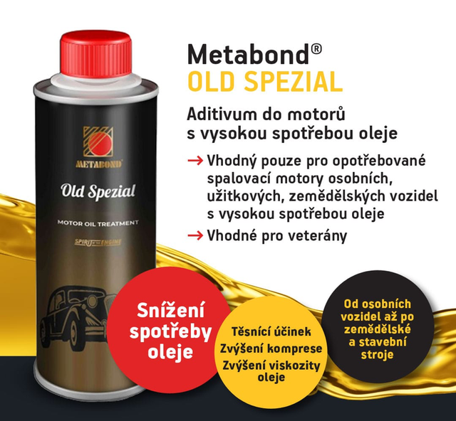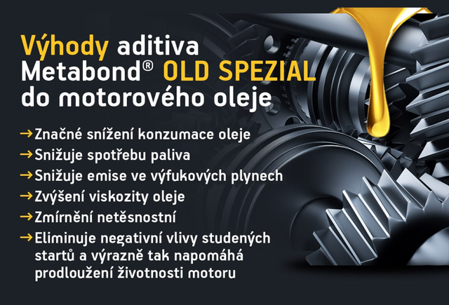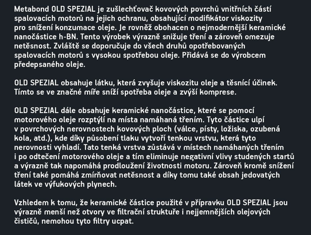 Old Spezial je zušlechťovač kovových povrchů určený pro vnitřní části opotřebovaných spalovacích motorů s vysokou spotřebou oleje. Obsahuje modifikátor viskozity pro snížení spotřeby oleje a keramické nanočástice, které výrazně snižují tření, zlepšují těsnost motoru a zvyšují kompresi. Přidává se do oleje předepsaného výrobcem. Látky zvyšující viskozitu oleje pomáhají omezit jeho únik a tím i kouřivost motoru. Keramické nanočástice se pomocí oleje dostávají na místa vystavená tření, kde vyplňují mikronerovnosti povrchů válců, pístů, ložisek a ozubených kol. Vytvářejí tenkou ochrannou vrstvu, která zůstává účinná i po odtečení oleje, čímž snižuje opotřebení při studených startech a prodlužuje životnost. Zároveň přispívá ke snížení množství škodlivin v plynech. Částice jsou menší než póry olejových filtrů. Vhodné pro benzínové, naftové, LPG a CNG motory s kat i DPF. Dávkování je 5 % k objemu oleje