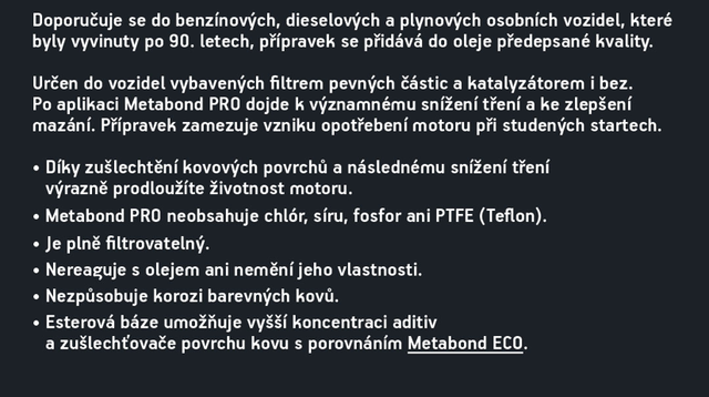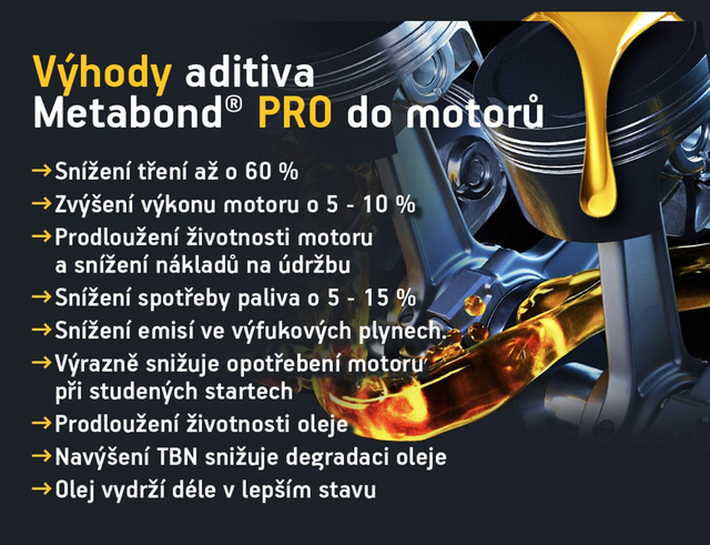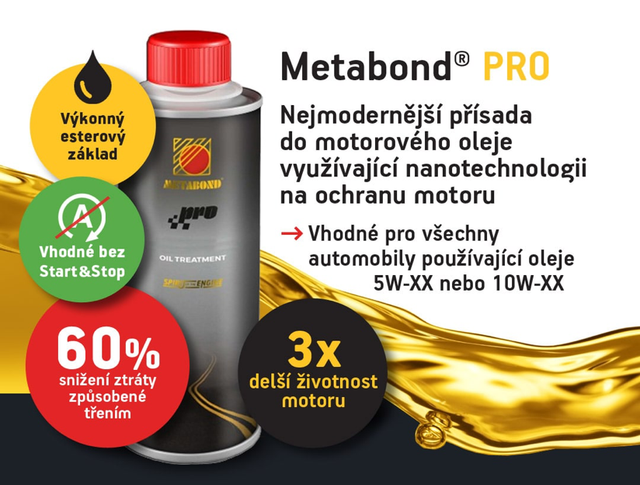 Metabond PRO je nejnovější aditivum do motorových olejů vyvinuté v roce 2023 pro vozy bez start&stop systému (benzín, nafta, LPG, CNG) do 3,5 t, vyrobené po 90. letech. Využívá nanotechnologii, esterový základ a vysoce koncentrovaný balíček aditiv, který výrazně snižuje tření (až o 60 %), zvyšuje výkon motoru (o 5–10 %), zlepšuje akceleraci, tišší chod a nižší provozní teploty oproti Metabond ECO. Díky zušlechťovači kovových povrchů chrání motor i při studených startech, částečném nedostatku nebo krátkodobé ztrátě tlaku oleje. Olej s Metabond PRO se pomaleji opotřebovává, déle si zachovává mazací vlastnosti a prodlužuje interval výměny oleje, což snižuje náklady i ekologickou zátěž. Aditivum prodlužuje životnost motoru a turba až trojnásobně, zlepšuje ochranu proti opotřebení, korozi i přepalování oleje a snižuje spotřebu paliva (o 5–15 %). Plně filtrovatelný, neobsahuje chlór, síru, fosfor ani PTFE, nemění vlastnosti oleje a nezpůsobuje korozi neželezných kovů.